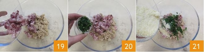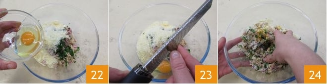 Verted en el tazón también los huevos 22 y aromatizad con la nuez moscada 23: amasad los ingredientes con las manos 24 hasta obtener una mezcla homogénea. Reservad la mezcla mientras preparáis la lámina para los ravioles.
