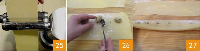 Retomad la masa que habéis dejado reposar y divididla en dos. Espolvoread ligeramente un trozo (el otro podéis mantenerlo cubierto con film para que no se seque) con la sémola y estiradlo con el rodillo o ayudándoos con la máquina para estirar la lámina 25: pasadla por los rodillos desde el grosor más ancho hasta el penúltimo grosor de la máquina para estirar la lámina hasta obtener rectángulos de aproximadamente medio cm de espesor. El ancho de la lámina deberá ser de 8 cm. Repetid estas operaciones también para el segundo trozo. Disponed las láminas sobre una superficie de trabajo ligeramente enharinada con sémola y colocad el relleno dividido en pequeñas bolas ayudándoos con una cucharilla 26. Disponedlas bien separadas sobre la lámina a aproximadamente 3 cm una de otra para luego poderla cerrar. Ahora cerrad la lámina de pasta a lo largo de modo que cubra totalmente el relleno y hacer coincidir los bordes largos 27.