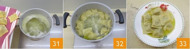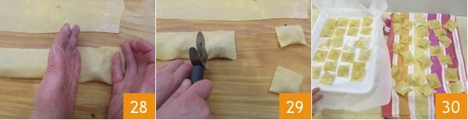 Con los dedos, ejercitad presión entre los diferentes montones de masa para expulsar el aire y hacer adherir la pasta 28. En este punto, sacad los ravioles con una rueda de corte dentada 29: deberán tener el tamaño de 4x4 cm. A medida que los producís, disponedlos sobre una bandeja con un paño limpio de cocina ligeramente enharinado con harina de sémola 30: obtendréis aproximadamente 80 ravioles.