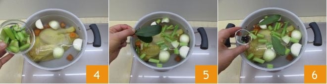Luego verted también el apio 4, las hojas de laurel 5 y las bayas de enebro 6.