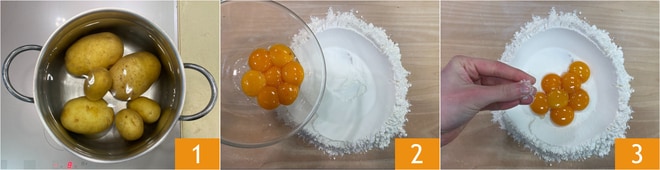 Para preparar los raviolis de patatas y cebolla con crema de queso, lo primero es cocer las patatas partiendo de agua fría hasta que estén tiernas; tardarán aproximadamente 30-40 minutos, dependiendo del tamaño. Mientras tanto, dedícate a la pasta fresca: coloca la harina en forma de volcán sobre la mesa de trabajo y echa las yemas en el centro 2, luego añade una pizca de sal 3 y un chorrito de agua.
