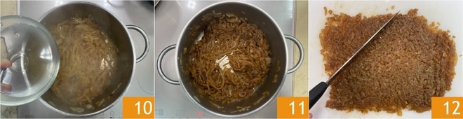 Cuando hayan cogido color, desglasa con el agua 10 y sigue mezclando para raspar bien el fondo. Sigue cocinando hasta que estén bien tiernas y caramelizadas 11; tardarán unos 10-15 minutos. Transfiere las cebollas caramelizadas a una tabla y pícalas finamente con un cuchillo 12.