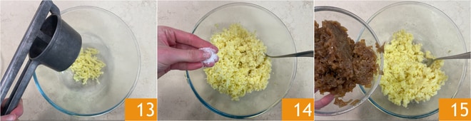Mientras tanto, las patatas estarán listas, así que pásalas por el pasapurés y recógelas en un bol grande 13. Sala 14, añade pimienta y las cebollas picadas 15.