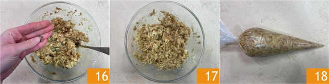 Aromatiza con las hojitas de tomillo 16 y mezcla el compuesto 17, luego transfiérelo a una manga pastelera sin boquilla 18.
