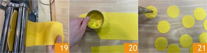 Ahora retoma la masa, divídela en porciones más pequeñas y extiéndela con la ayuda de una máquina para pasta empezando por el grosor más grueso hasta llegar al penúltimo (aproximadamente 2 mm) 19. Da algunas vueltas a las hojas al pasarlas de un rodillo a otro para dar más fuerza a la masa. Coloca las hojas sobre la mesa de trabajo y saca discos con un cortapastas de 7 cm de diámetro 20. Puedes amasar y extender nuevamente los recortes para hacer más raviolis. Estruja una nuez de relleno en el centro de cada disco 21, luego rocíalos con un poco de agua para facilitar el cierre.