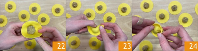 Dóblalos por la mitad para formar una media luna 22, luego presiona bien los bordes para sellar el cierre, cuidando de sacar todo el aire. Por último, cierra el ravioli empujando suavemente con el pulgar hacia adentro 23 y pellizcando juntas las extremidades 24. Procede de esta manera para formar todos los raviolis; con estas cantidades obtendrás unos cincuenta.