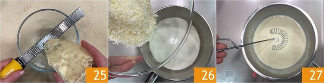 En este punto, prepara la fondue: ralla el castelmagno 25. En un cazo, vierte la nata y el queso rallado 26, luego calienta a fuego muy bajo durante unos diez minutos hasta que se haya derretido, mezclando de vez en cuando con un batidor pequeño 27.