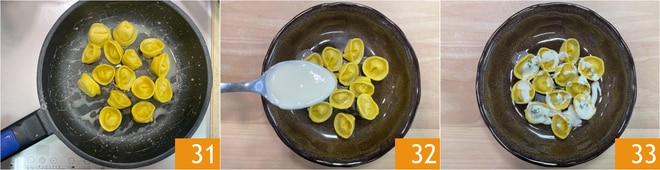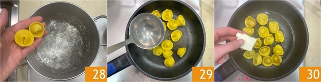 Estás listo para la cocción: lleva a ebullición una olla de agua con sal, echa unos pocos raviolis a la vez 28 y cocina durante 2-3 minutos. Escurre los raviolis en una sartén, luego añade un cucharón del agua de cocción 29 y la mantequilla 30.