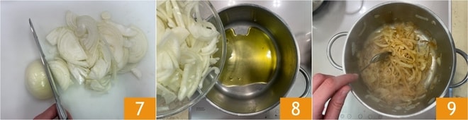 Mientras tanto, ocúpate del relleno: pela las cebollas y córtalas en juliana 7, luego échalas en una cazuela donde habrás calentado un chorrito de aceite 8. Sofríe a fuego alto mezclando a menudo 9.