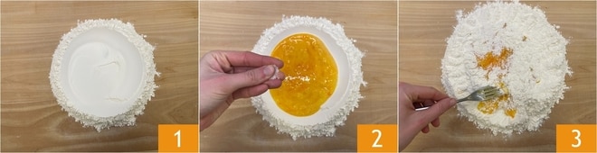 Para preparar los ravioles de pescado con salsa de azafrán, empezad por la pasta fresca: colocad la harina en forma de volcán sobre la superficie de trabajo 1 y verted las yemas en el centro, luego añadid una pizca de sal 2 y un chorrito de agua. Comenzad a incorporar la harina batiendo los huevos con un tenedor 3, luego ayudáos con una rasqueta.