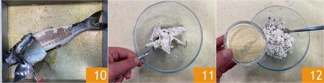 Una vez transcurrido el tiempo de cocción del pescado, desmenuzad la lubina quitando la piel y las espinas 10. Reservad el fondo de cocción del pescado, luego trasladad los filetes a un bol 11 y añadid el pan rallado 12.