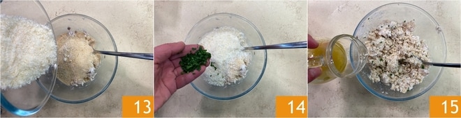 Añadid también el queso rallado 13 y el perejil picado 14, luego mezclad. Verted un poco del fondo de cocción del pescado 15.