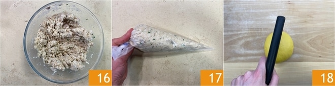 Mezclad y ajustad la cantidad de líquido según la consistencia de la mezcla, que debe ser suave pero no demasiado compacta 16. Trasladad el relleno a una manga pastelera sin boquilla 17. Ahora retomad la masa y divididla en porciones más pequeñas con una rasqueta 18.