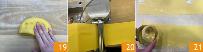 Aplanad la primera porción 19 y mantened las otras envueltas en el papel film para evitar que se sequen. Extendad la masa con la ayuda de una máquina para pasta comenzando con el grosor más ancho 20 hasta llegar al penúltimo (aproximadamente 2 mm). Colocad las láminas sobre la superficie de trabajo y cortad discos con un cortador de galletas de 7 cm de diámetro 21. Podéis amasar y extender nuevamente los restos.