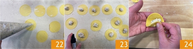 Apretad una nuez de relleno en el centro de cada disco 22, luego rociad los bordes con un poco de agua para facilitar el cierre 23. Doblad cada disco por la mitad para formar una media luna 24 y presionad bien los bordes para sellar el cierre.