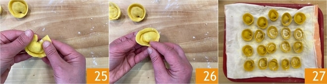 Unid los extremos empujando suavemente la parte con el relleno con el pulgar hacia dentro 25 y pellizcándolos juntos 26. Proceded de esta manera para formar todos los ravioles; con estas cantidades obtendréis unos cincuenta 27.
