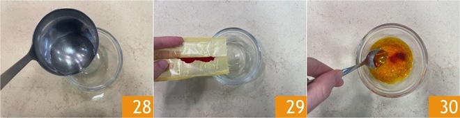 Preparad la salsa de azafrán: en un cuenco verted un cazo escaso de agua tibia 28, luego añadid el azafrán en polvo 29 y mezclad 30.