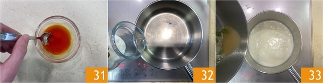 Una vez que el azafrán se haya disuelto completamente, reservad 31. En un cazo verted la nata fresca 32 y calentedla a fuego bajo durante unos 10 minutos para que se reduzca, luego añadid el fondo de cocción de la lubina 33.
