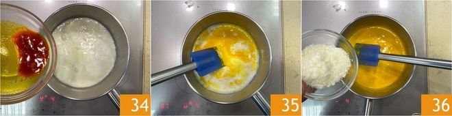 Añadid también el azafrán disuelto 34, luego mezclad 35 e incorporad el queso rallado 36. Mezclad de nuevo, apagad el fuego y reservad la salsa.