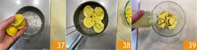 Llevad a ebullición una olla de agua con sal y cocinad los ravioles durante 2-3 minutos 37, luego escurridlos 38 en un bol y aderezadlos con un chorrito de aceite de oliva 39.