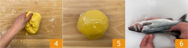 Finalmente trabajad con las manos 4 hasta obtener una masa compacta, lisa y homogénea. Envolved el bloque en papel film 5 y dejadlo reposar en el frigorífico durante al menos 20 minutos. Mientras tanto, tomad la lubina ya eviscerada y cortad las aletas 6.