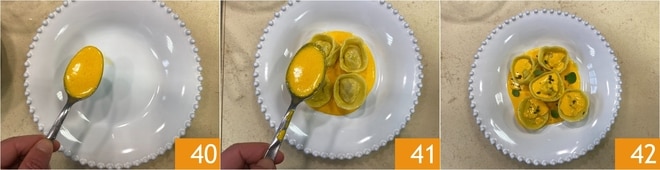 Emplatad distribuyendo en el fondo una pequeña parte de la salsa 20, luego colocad los ravioles y aderezad con más salsa por encima 41, luego decorad con hojitas de mejorana. ¡Vuestros ravioles de pescado con salsa de azafrán están listos para servirse 42!
