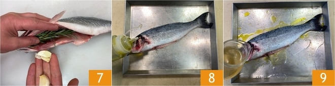 Rellenad el pescado con las hierbas aromáticas y los dientes de ajo 7, luego colocadlo en una bandeja, salpimentad y aderezad con el aceite 8. Bañad la lubina con el caldo de verduras 9 y el vino blanco, luego cocinad en horno precalentado a 200° por unos 15-20 minutos.