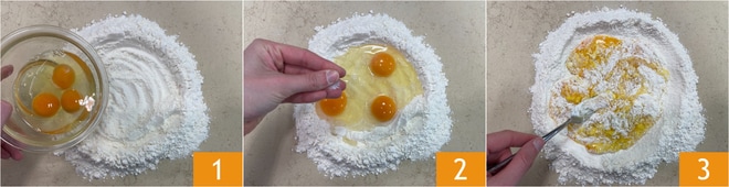 Para preparar los ravioles rellenos de gallo, primero en una tabla, colocar la harina en forma de fuente y poner en el centro los huevos 1. Añadir una pizca de sal 2 e incorporar poco a poco la harina con un tenedor 3.