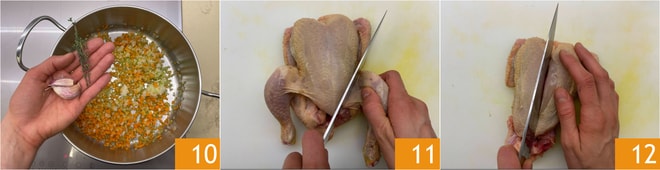 Añadir también dos dientes de ajo aplastados con piel y una ramita de tomillo y romero 10. Sofreír a fuego lento durante 5 minutos o hasta que las verduras estén tiernas. Mientras tanto, cortar el gallo en trozos 11 12.