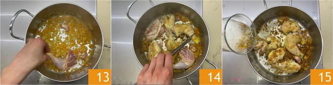 Añadir los trozos de gallo a la olla 13 y dorar cada lado hasta que estén dorados 14. Verter la cerveza en la olla 15.
