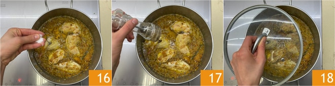 Ajustar de sal 16 y pimienta 17. Cubrir con una tapa 18 y dejar cocinar durante aproximadamente 1 hora o hasta que la carne se desmenuce fácilmente.