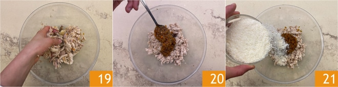 Retirar la carne de la olla y dejar enfriar un poco. Luego desmenuzar la carne 19, eliminando la piel y los huesos, y pasarla a un bol. Añadir el fondo de cocción, las verduras 20 y el Parmigiano 21.