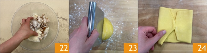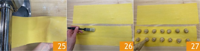 Mezclar 22 hasta obtener una mezcla homogénea. Dejar enfriar completamente y poner todo en una manga pastelera. Tomar la masa y dividirla por la mitad 23. Extender las hojas con una máquina de pasta. Comenzar con el grosor más grande, luego doblar los extremos de la hoja hacia el centro 24. Pasarla nuevamente entre los rodillos disminuyendo gradualmente el grosor.