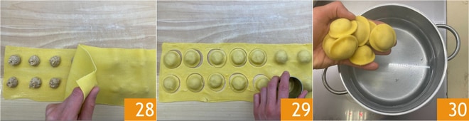 Cubrir con la segunda hoja 28. Procurar eliminar el aire alrededor del relleno y hacer que las dos hojas se adhieran bien, de esta manera los ravioles no se abrirán durante la cocción. Con un cortador de pasta, dar forma a los ravioles 29. Cocerlos en agua hirviendo con sal durante 3-4 minutos 30, hasta que floten.