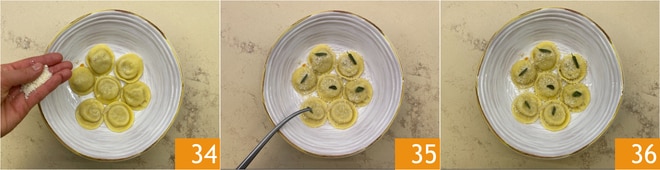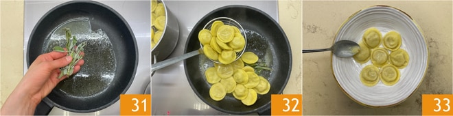 Mientras tanto, en una sartén derretir la mantequilla, añadir las hojas de salvia 31. Escurrir los ravioles y transferirlos a la sartén 32, saltear delicadamente durante unos minutos. Emplatar y añadir la mantequilla derretida 33.