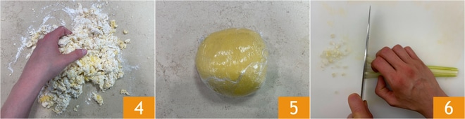 Luego amasar con las manos 4 hasta obtener una masa lisa y homogénea. Envolverla en film transparente 5 y dejar reposar en un lugar fresco y seco durante al menos 30 minutos. Mientras tanto, cortar el apio en cubitos pequeños 6.