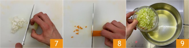 Cortar finamente también la cebolla 7 y las zanahorias 8. En una olla, verter un poco de aceite y añadir las verduras 9.