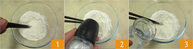 Para preparar los raviolis chinos al vapor, lo primero es preparar la masa: vierte la harina en un bol y forma un volcán 1, luego añade una pizca de sal 2 y vierte el agua tibia en un hilo mientras empiezas a mezclar con los palillos 3.