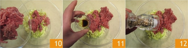 Añade la carne picada 10, la salsa de soja clara 11, sal y pimienta 12.