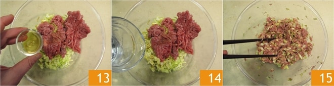 Añade también el vino de arroz 13 y el agua 14: la cantidad de agua es fundamental para obtener un relleno de la consistencia adecuada, ni demasiado blando ni demasiado seco. Mezcla bien para amalgamar todo 15, luego deja reposar durante 10 minutos.