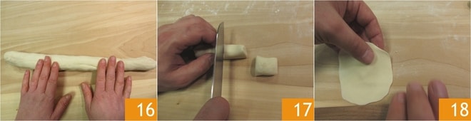 Existen 2 maneras de trabajar la masa, una tradicional y una más moderna. Te mostramos el método tradicional: forma un cilindro de masa sobre la superficie ligeramente enharinada 16 y córtalo en trozos de unos 2 cm 17. Añade un poco más de harina y aplasta los trozos de masa con la palma de la mano para crear discos. Luego utiliza un rodillo para adelgazar solo los bordes del disco de masa mientras con la otra mano lo haces girar 18. De esta manera, quedará más grueso en el centro, donde se coloca el relleno, y más fino en los bordes, que se unirán durante el cierre. Si no tienes mucha habilidad manual, puedes proceder con el segundo método: en este caso, extiende la masa con ayuda de una máquina de pasta hasta un grosor de 1 mm, luego corta discos con un cortador de pasta de 8 cm de diámetro.