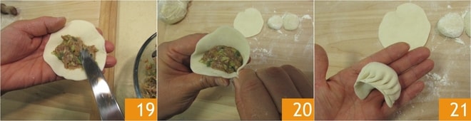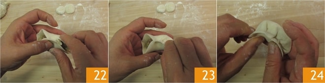 Para aquellos que no tienen mucha habilidad manual, también en este caso existe otro método: sujeta el disco entre los dedos como se describió anteriormente y une los bordes en el centro, presionando para pegarlos 22. Con el índice, dobla la masa de un lado y presiona para sellarla 23, luego haz lo mismo del otro lado usando los otros dedos 24.