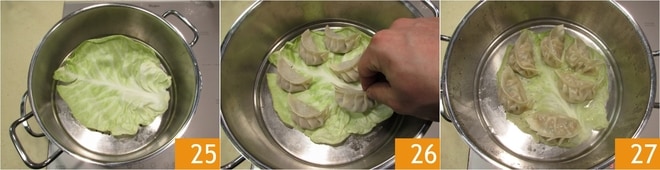 Cuando hayas cerrado todos los raviolis, procede con la cocción: puedes utilizar una vaporera normal o una de bambú. Forra el fondo con una hoja de col, rompiendo ligeramente los lados para hacerla más plana 25, luego coloca encima los raviolis bien espaciados entre sí 26. Lleva el agua en la vaporera a ebullición (si tienes una de bambú, puedes usar un wok), luego baja un poco el fuego y coloca el recipiente con la tapa. Cocina durante unos 8 minutos 27. ¡Tus raviolis chinos al vapor están listos para ser disfrutados!
