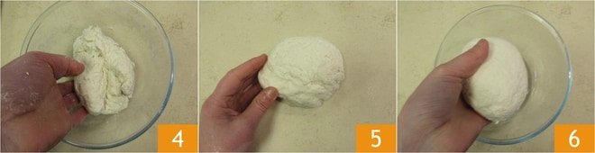 Sigue amasando con las manos para compactar los ingredientes 4, luego transfiere la mezcla a una superficie de trabajo ligeramente enharinada y forma una bola 5. Coloca la bola en el bol 6, cubre con un paño y deja reposar durante 30 minutos en un lugar fresco y seco.