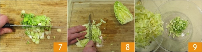 Mientras tanto, prepara el relleno: pica finamente la cebolleta, incluida la parte verde del tallo 7, luego haz lo mismo con la col 8. Transfiere la cebolleta y la col picadas a un bol grande 9.