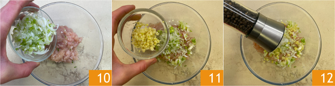 Pon la carne picada en un bol, luego añade la parte blanca de la cebolleta 10, el jengibre 11, la sal y la pimienta 12.<\/p>