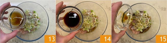 Agrega también el vino de arroz 13, la salsa de soja 14 y el aceite de sésamo 15.<\/p>