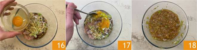 Finalmente añade el huevo 16 y mezcla bien todo con las manos o con un tenedor 17. Deja reposar la mezcla en el frigorífico durante 30 minutos 18, cubierta con film transparente.<\/p>