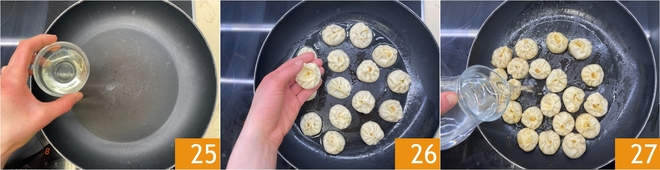 Estás listo para cocinar: calienta bien una sartén con un poco de aceite de girasol 25, luego coloca los ravioles dejando un poco de espacio entre ellos 26. Mantén el fuego a medio y, tan pronto como empiecen a chisporrotear, vierte agua hasta cubrirlos por la mitad 27.<\/p>