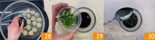 Coloca la tapa 28 y cocina por 10-15 minutos. Mientras tanto, prepara la salsa de acompañamiento: en un cuenco pequeño, vierte la salsa de soja, la parte verde de la cebolleta 29 y un chorrito de vinagre de arroz 30.<\/p>